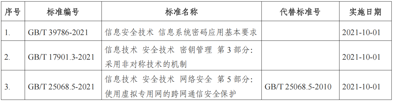 根據(jù)2021年3月9日國家市場監(jiān)督管理總局、國家標準化管理委員會發(fā)布的中華人民共和國國家標準公告(2021年第3號),全國信息安全標準化技術(shù)委員會歸口的3項國家標準正式發(fā)布。具體清單如下:
