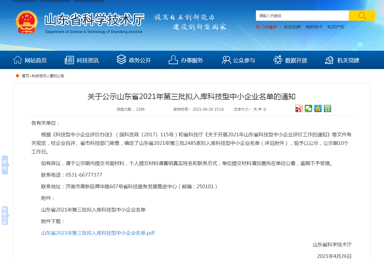 4月26日,根據(jù)《科技型中小企業(yè)評價辦法》(國科發(fā)政〔2017〕115號)和省科技廳《關(guān)于開展2021年山東省科技型中小企業(yè)評價工作的通知》等文件有關(guān)規(guī)定,經(jīng)企業(yè)自評、省市科技部門審查,山東省2021年第三批擬入庫科技型中小企業(yè)名單公示。山東CA成功獲得認定。