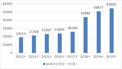 圖10 2013—2020年我國(guó)IPv6地址數(shù)量(塊/32)