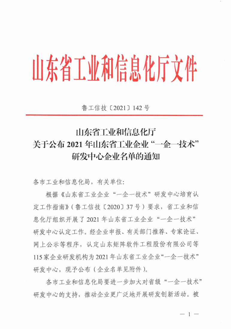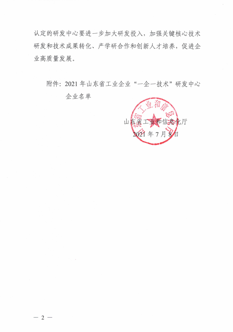 7月9日,山東省工業(yè)和信息化廳官網(wǎng)發(fā)布2021年山東省工業(yè)企業(yè) “一企一技術(shù)”研發(fā)中心企業(yè)名單,山東CA成功獲得認定。