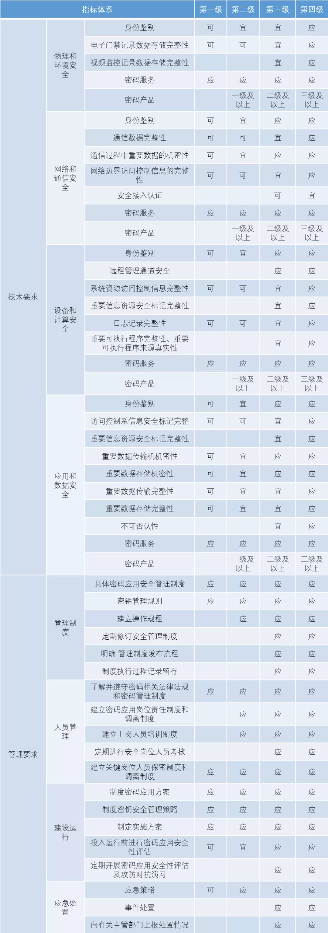 綜合以上的總體要求分析,以下是依據(jù)GB/T 39786-2021國(guó)標(biāo)文件里針對(duì)第一級(jí)到第四級(jí)的密碼應(yīng)用基本要求匯總: