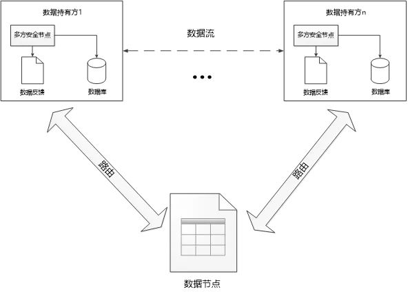 通常安全多方計(jì)算系統(tǒng)中,每個(gè)數(shù)據(jù)持有者由數(shù)據(jù)反饋、數(shù)據(jù)庫(kù)和安全多方計(jì)算節(jié)點(diǎn)構(gòu)成。所有的數(shù)據(jù)持有者權(quán)限相同,可以同時(shí)執(zhí)行計(jì)算任務(wù)。各個(gè)數(shù)據(jù)持有者之間的數(shù)據(jù)流通稱為數(shù)據(jù)流,而每個(gè)數(shù)據(jù)持有者在本地完成數(shù)據(jù)的處理并將處理后的結(jié)果發(fā)送給數(shù)據(jù)節(jié)點(diǎn)。這種系統(tǒng)可以保證在大數(shù)據(jù)環(huán)境下用戶的隱私,如圖3所示。