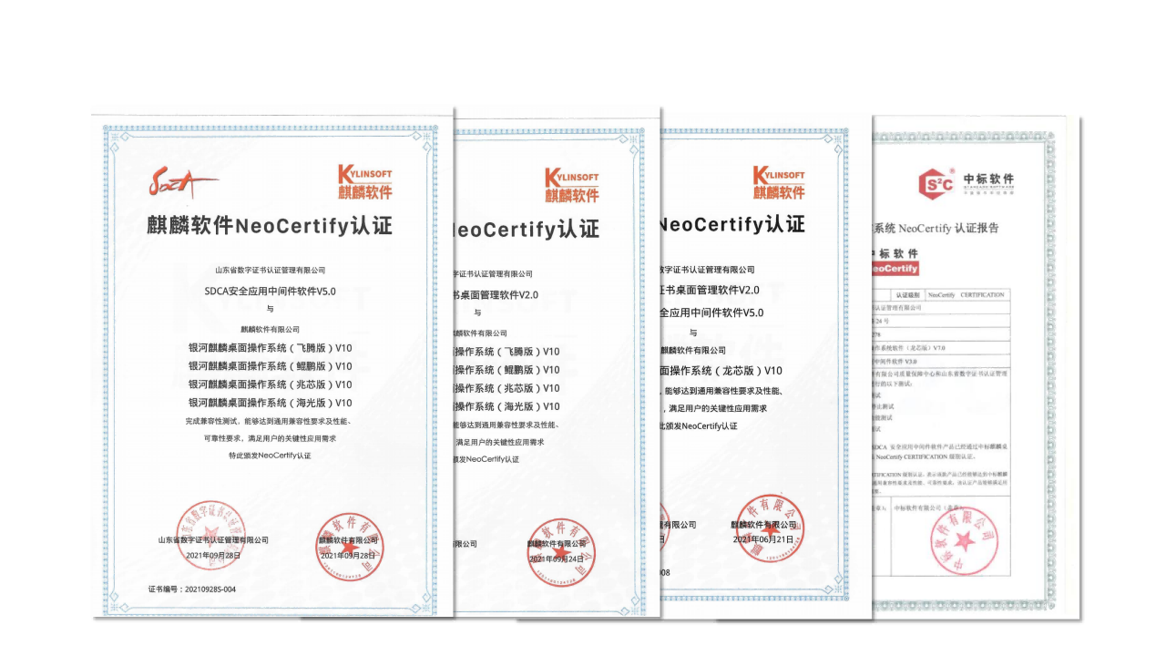 近日,經(jīng)過多次的嚴格聯(lián)合測試后,山東CA旗下的SDCA安全應(yīng)用中間件系列、SDCA桌面管理軟件系列分別獲得麒麟軟件在飛騰、鯤鵬、龍芯、兆芯、海光等5個國產(chǎn)處理器平臺上的NeoCertify認證,并與統(tǒng)信桌面操作系統(tǒng)V20在飛騰、鯤鵬、龍芯、兆芯、海光、海思等6個國產(chǎn)芯片廠商9款處理器平臺上完成了通用軟硬件適配認證。測試表明,山東CA上述產(chǎn)品與銀河麒麟及中標麒麟桌面操作系統(tǒng)、統(tǒng)信桌面操作系統(tǒng)V20在主流國產(chǎn)處理器平臺上運行穩(wěn)定,能夠達到通用兼容性要求及性能、可靠性要求,滿足用戶的關(guān)鍵性應(yīng)用需求。