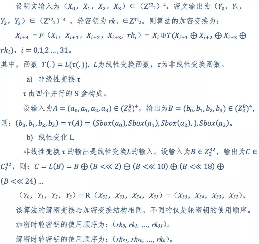 SM4密碼算法:算法采用32輪非線性迭代結(jié)構(gòu)。解密算法與加密算法的結(jié)構(gòu)相同,只是輪密鑰的使用順序相反,解密輪密鑰是加密輪密鑰的逆序。