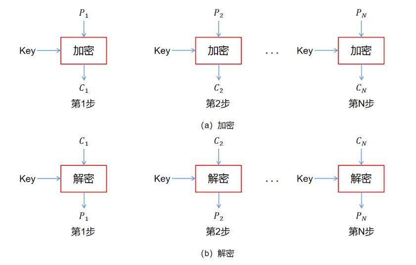 電碼本模式:電碼本模式直接利用加密算法分別對(duì)分組數(shù)據(jù)組加密。在給定的密鑰下同一明文組總產(chǎn)生同樣的密文組。這種方式會(huì)暴露明文數(shù)據(jù)的格式和統(tǒng)計(jì)特征,由于重要的數(shù)據(jù)常常在同一位置上出現(xiàn),使密碼分析者可以對(duì)其進(jìn)行統(tǒng)計(jì)分析、重傳和代換攻擊(圖3)。
