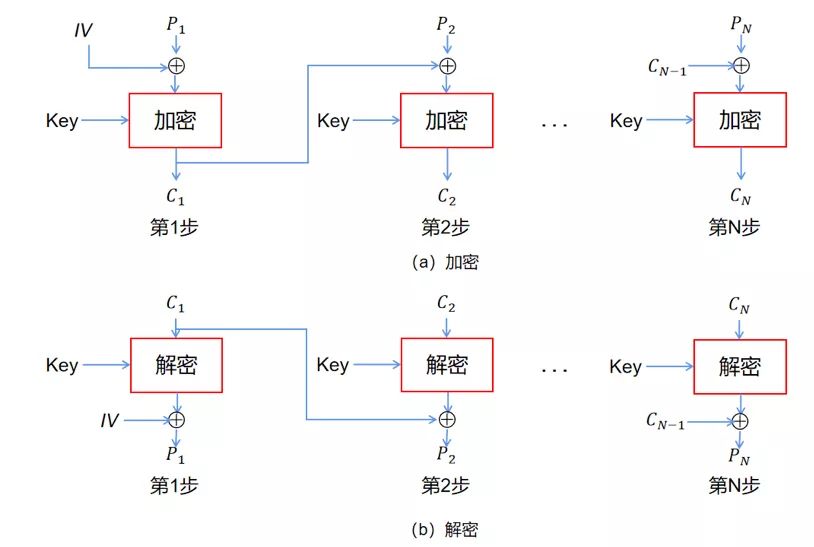 分組鏈接模式:在CBC模式中,首先將明文分組與前一個(gè)密文分組進(jìn)行XOR運(yùn)算,然后再進(jìn)行加密。密文分組像鏈條一樣相互連接在一起(圖4)。