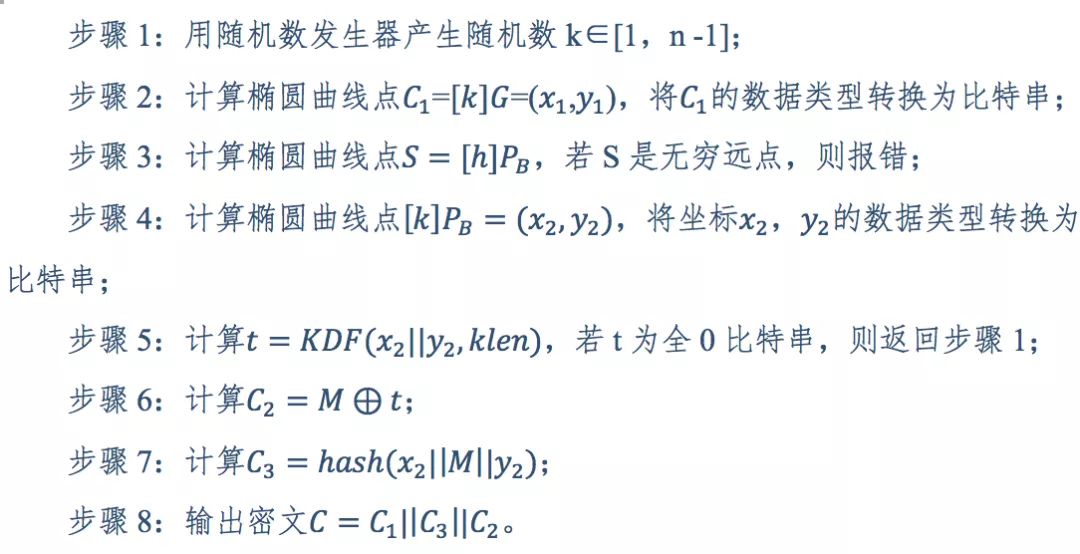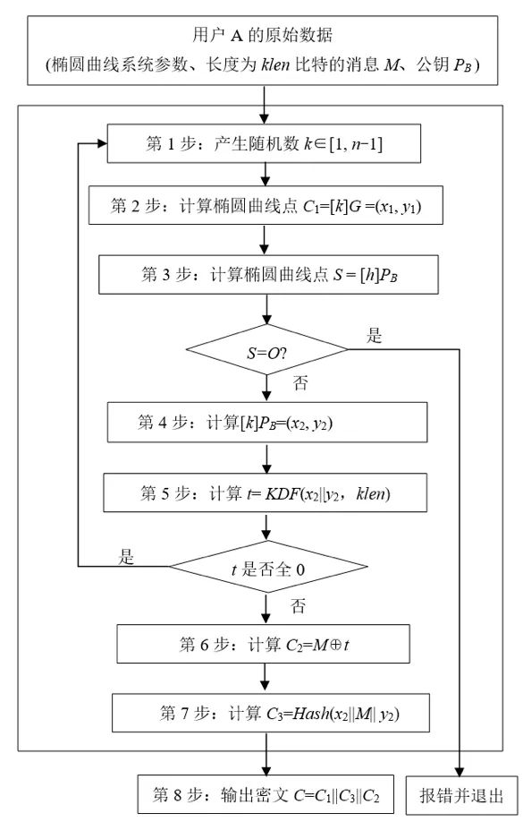 SM2加密算法:根據(jù)《GB/T 32918.4-2016信息安全技術(shù) SM2橢圓曲線公鑰密碼算法 第4部分:公鑰加密算法》的要求,SM2加密算法流程如下。
