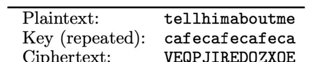 可以使用統(tǒng)計攻擊來破解“單字母替代加密”,因為它的密鑰定義了一個固定的映射,該映射逐字應(yīng)用于明文。在“多字母替代加密”中,該攻擊無效,它的密鑰定義了應(yīng)用于明文字符塊的映射。多字母替代加密“平滑”了密文中字符的頻率分布,使其更難進(jìn)行統(tǒng)計分析。維吉尼亞加密就是多字母替代加密的一種,可以看作是將移位密碼的不同實(shí)例應(yīng)用于明文的不同部分。如下圖所示,它的密鑰是一個字符串。加密是通過按密鑰的下一個字符表示的數(shù)量移動每個明文字符來完成的,必要時在密鑰中環(huán)繞。