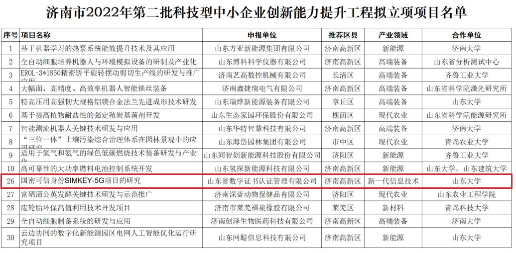 近日,濟(jì)南市科學(xué)技術(shù)局公示了濟(jì)南市2022年第一、二批科技型中小企業(yè)創(chuàng)新能力提升工程擬立項(xiàng)項(xiàng)目名單。山東CA與山東大學(xué)合作申報(bào)的“國(guó)密可信身份SIMKEY-5G項(xiàng)目的研究”入選第二批擬立項(xiàng)“新一代信息技術(shù)”項(xiàng)目名單。