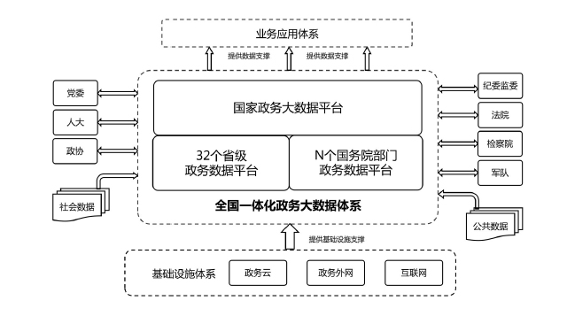 全國一體化政務大數(shù)據(jù)體系包括三類平臺和三大支撐。三類平臺為“1+32+N”框架結(jié)構(gòu)?!?”是指國家政務大數(shù)據(jù)平臺,是我國政務數(shù)據(jù)管理的總樞紐、政務數(shù)據(jù)流轉(zhuǎn)的總通道、政務數(shù)據(jù)服務的總門戶;“32”是指31個省(自治區(qū)、直轄市)和新疆生產(chǎn)建設(shè)兵團統(tǒng)籌建設(shè)的省級政務數(shù)據(jù)平臺,負責本地區(qū)政務數(shù)據(jù)的目錄編制、供需對接、匯聚整合、共享開放,與國家平臺實現(xiàn)級聯(lián)對接;“N”是指國務院有關(guān)部門的政務數(shù)據(jù)平臺,負責本部門本行業(yè)數(shù)據(jù)匯聚整合與供需對接,與國家平臺實現(xiàn)互聯(lián)互通,尚未建設(shè)政務數(shù)據(jù)平臺的部門,可由國家平臺提供服務支撐。三大支撐包括管理機制、標準規(guī)范、安全保障三個方面。