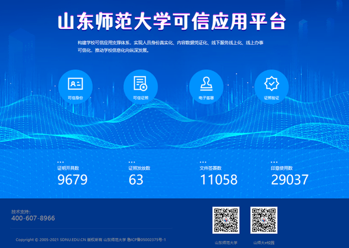 近日,由山東CA承擔(dān)建設(shè)的山東師范大學(xué)可信應(yīng)用平臺(tái)建設(shè)項(xiàng)目順利通過專家組驗(yàn)收,正式上線運(yùn)行。該平臺(tái)的上線,標(biāo)志著山師大全面建成以教育服務(wù)為主線,以密碼技術(shù)應(yīng)用為核心,以安全可信為基礎(chǔ)的校園可信應(yīng)用服務(wù)體系,為山師大實(shí)施教育數(shù)字化戰(zhàn)略提供了基礎(chǔ)性安全保障。試運(yùn)行期間已完成文件簽署11058份,開具電子證明9679份,發(fā)放電子證照63份,電子簽章使用29037次。