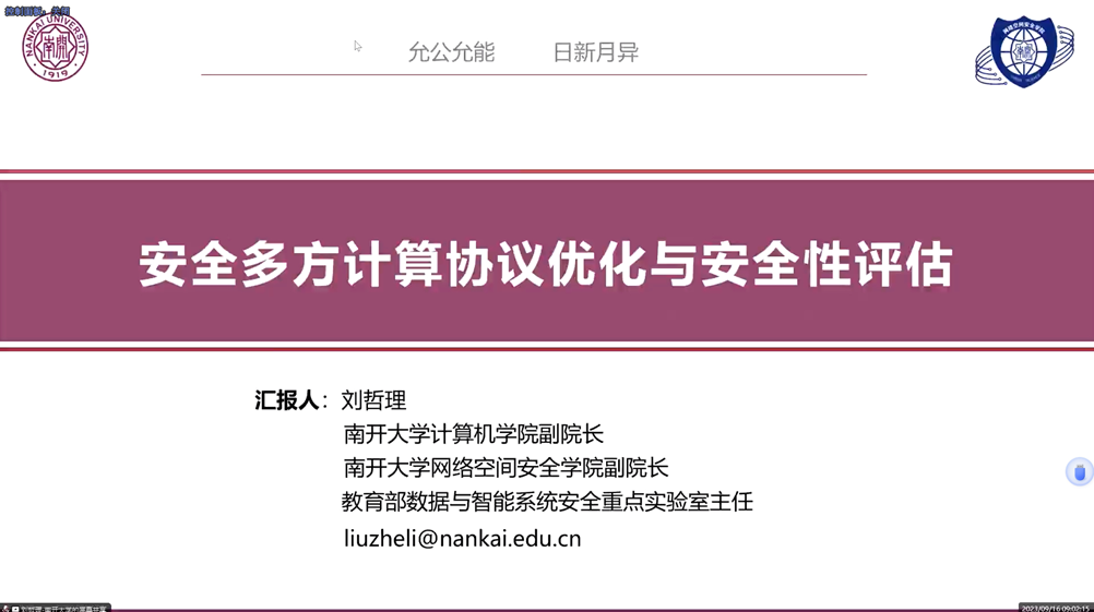 會(huì)議由省商用密碼協(xié)會(huì)會(huì)長(zhǎng),山東大學(xué)徐秋亮教授主持開(kāi)幕。論壇中,首先由劉哲理教授做了題為《安全多方計(jì)算協(xié)議優(yōu)化與安全性評(píng)估》的報(bào)告,介紹典型密文交集運(yùn)算的方案設(shè)計(jì),及其在精準(zhǔn)廣告推薦業(yè)務(wù)中的應(yīng)用;進(jìn)而,介紹以密文集合交集運(yùn)算為基礎(chǔ)協(xié)議的安全應(yīng)用中面臨的安全性問(wèn)題,介紹團(tuán)隊(duì)在集合成員推理攻擊方面的新工作。然后陳小軍研究員做了題為《分布式學(xué)習(xí)與數(shù)據(jù)安全》的報(bào)告,聚焦在分布式學(xué)習(xí)中存在的問(wèn)題,包括聯(lián)邦學(xué)習(xí)的可用性、隱私計(jì)算的效率與數(shù)據(jù)投毒攻擊與防御等,討論相關(guān)研究進(jìn)展。最后,史文征高工做了《加強(qiáng)商用密碼應(yīng)用,筑牢網(wǎng)絡(luò)安全可信基石》的報(bào)告,對(duì)網(wǎng)絡(luò)及密碼安全法律法規(guī)進(jìn)行解讀、對(duì)網(wǎng)絡(luò)安全檢測(cè)評(píng)估及密碼應(yīng)用安全檢測(cè)評(píng)估工作內(nèi)容及要求進(jìn)行解讀、對(duì)密碼應(yīng)用建設(shè)及改造內(nèi)容進(jìn)行講解。最后,山東省密碼管理局商用密碼處王玉華副處長(zhǎng)對(duì)論壇做了總結(jié)發(fā)言。
